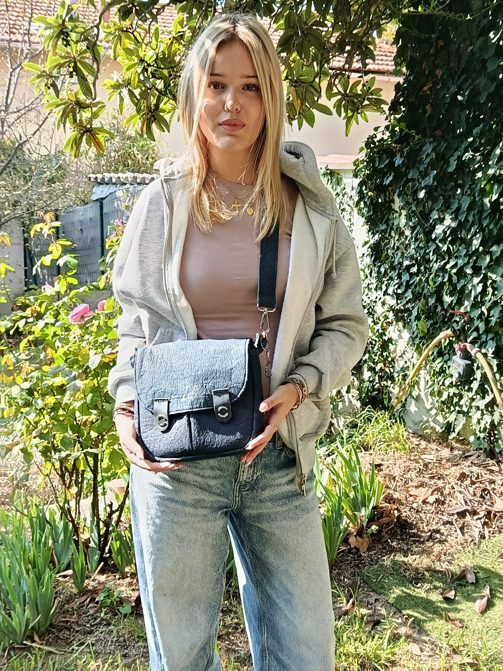 En Cuir d’Ananas de grande qualité aussi solide que le Cuir animal. Doublée de synthétique satiné avec poches et Mousqueton. Se porte en bandoulière réglable. Est embossée sur le devant de ma Marque.