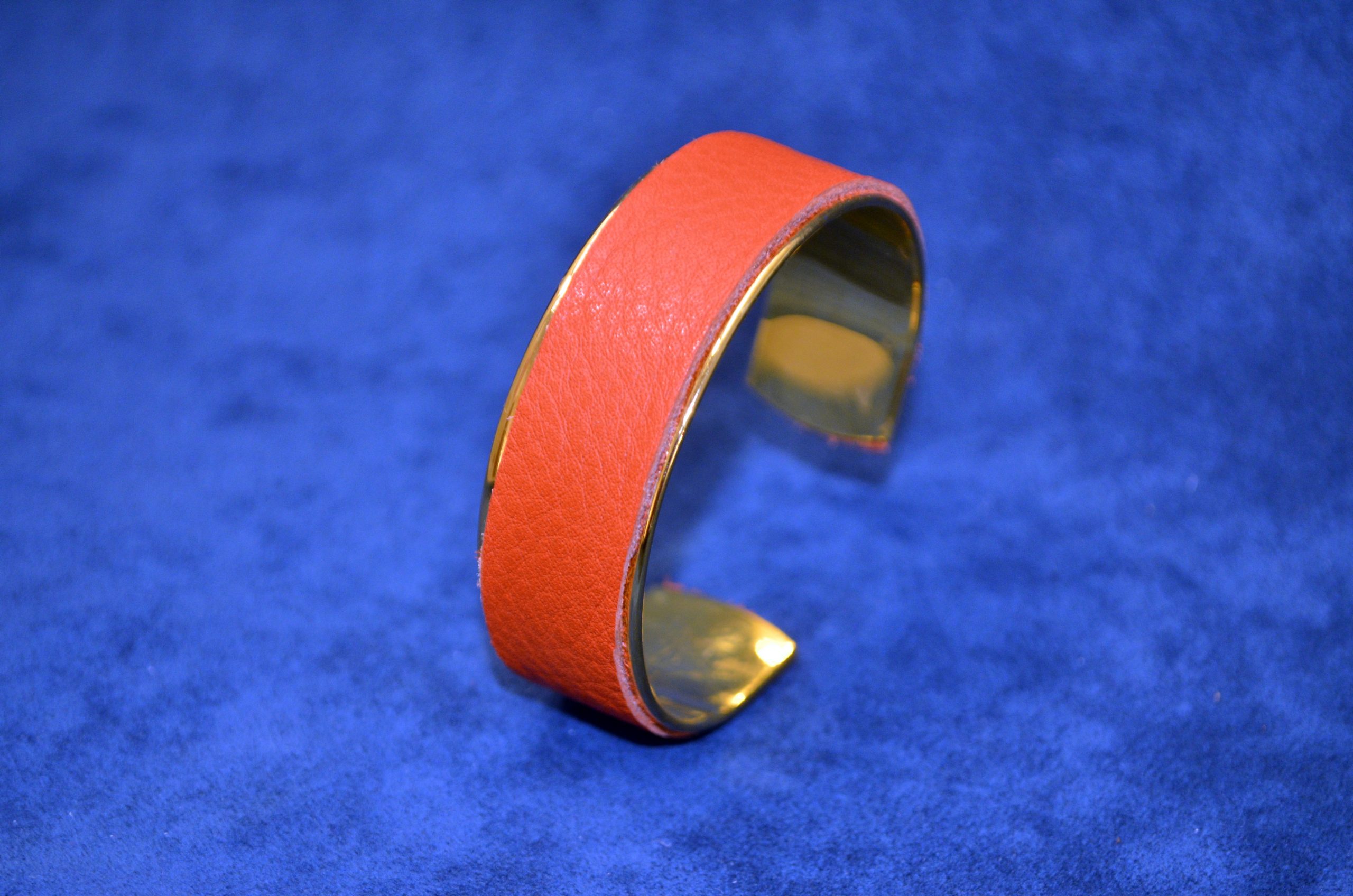 Bracelet en plaqué Or 18 Carats, gainé de Cuir recyclé orange. Se porte au poignet.