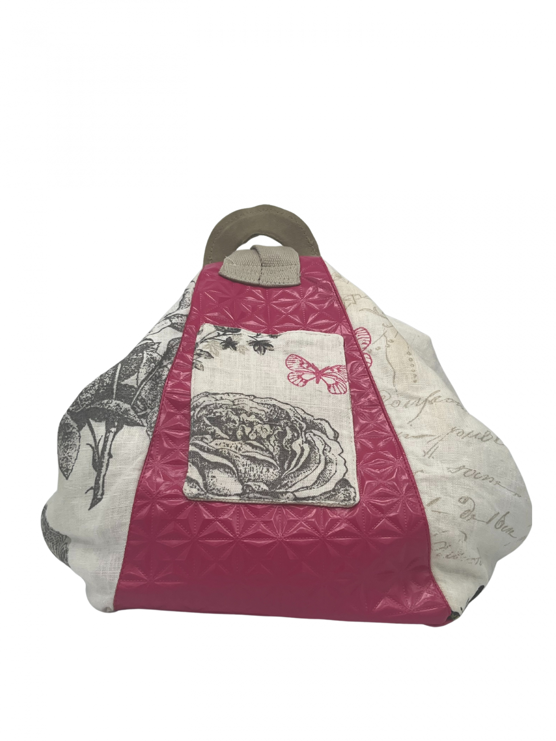 Est en grosse toile de Coton à motifs floraux et en imitation Cuir rose foncé. Comprend 1 poche sur le devant pour mettre le téléphone portable. Se porte au Dos et à l’épaule grâce à 2 sangles beige en Coton biologique réglables. Est doublé de grosse toile de Coton beige avec 1 poche avec 1 fermeture éclair pour mettre le porte monnaie.