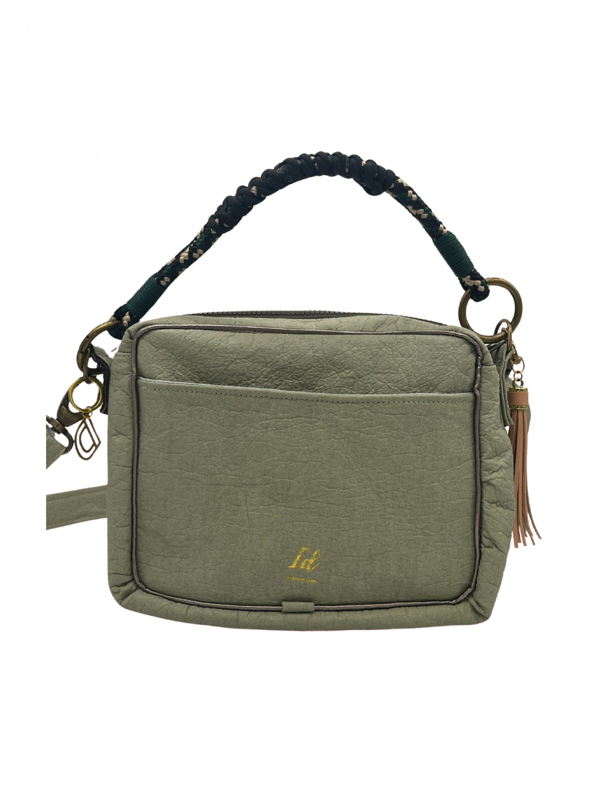 En Cuir d’ananas et Coton biologique de couleur vert amande avec Poches. Est orné d’un « Passepoil » doré sur le devant. Comprend une poche doublée de Coton Vert Amande sur le devant avec un bouton pression doré aimanté pour la fermer. Se ferme avec une fermeture éclair sur le dessus avec 2 curseurs. Est doublé de 3 poches dont 1 avec une fermeture éclair. Est embossé de ma Marque « ID » sur le bas de la poche devant. Se porte en bandoulière réglable et amovible avec une boucle. Peut se porter à la main à l’aide d’une anse tressée en corde de 2 couleurs (noir et vert). Un Pompon de couleur abricot orne le côté du Sac ainsi que la lettre « D ».